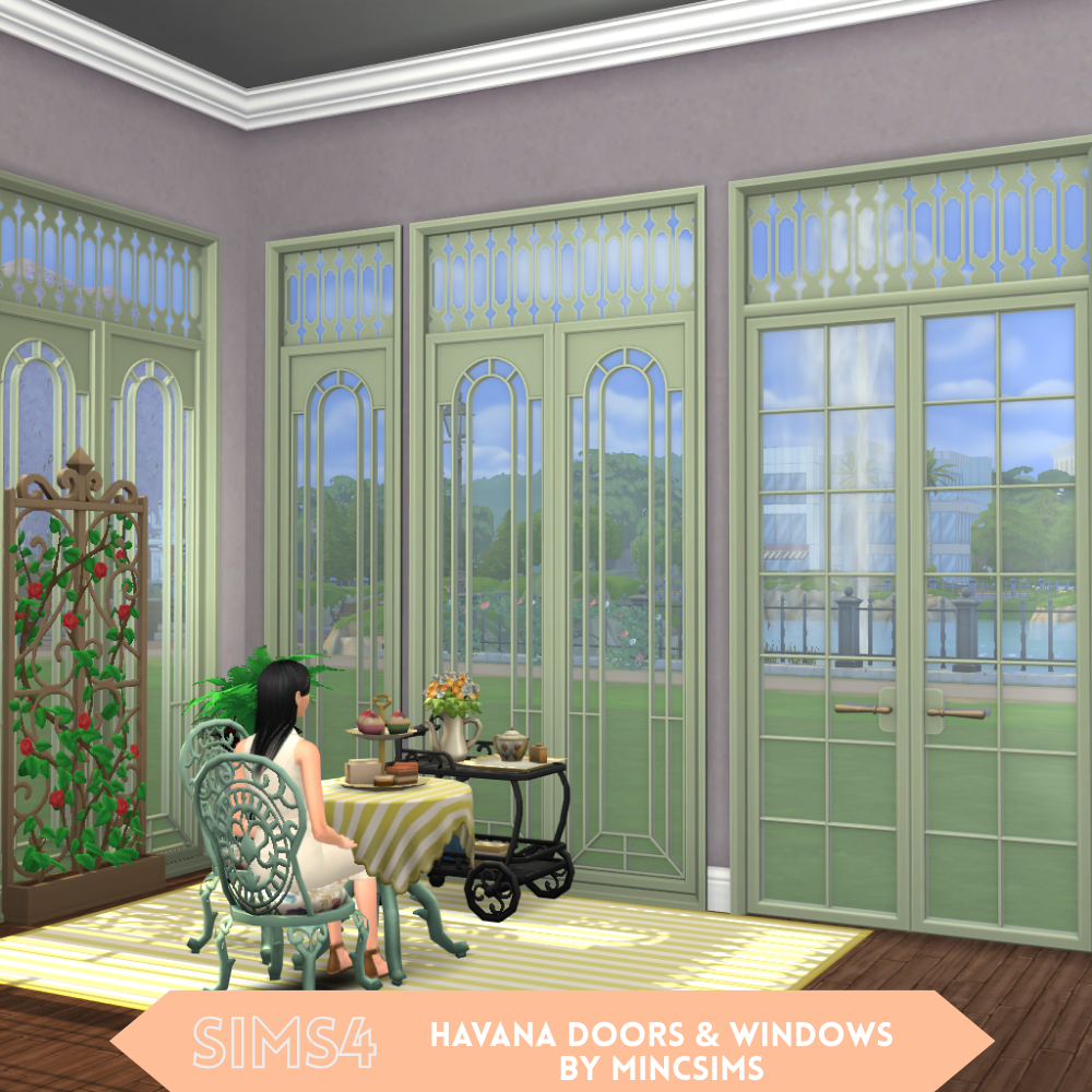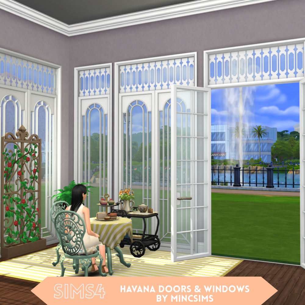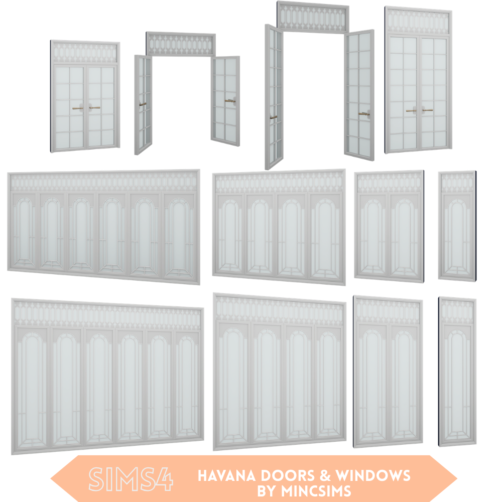 Bring a touch of elegant, vintage charm to your Sims' homes with the Havana Doors & Windows set! Featuring beautifully detailed cut-out transoms and tall, arched glass panels, this set is perfect for letting the sunshine in.